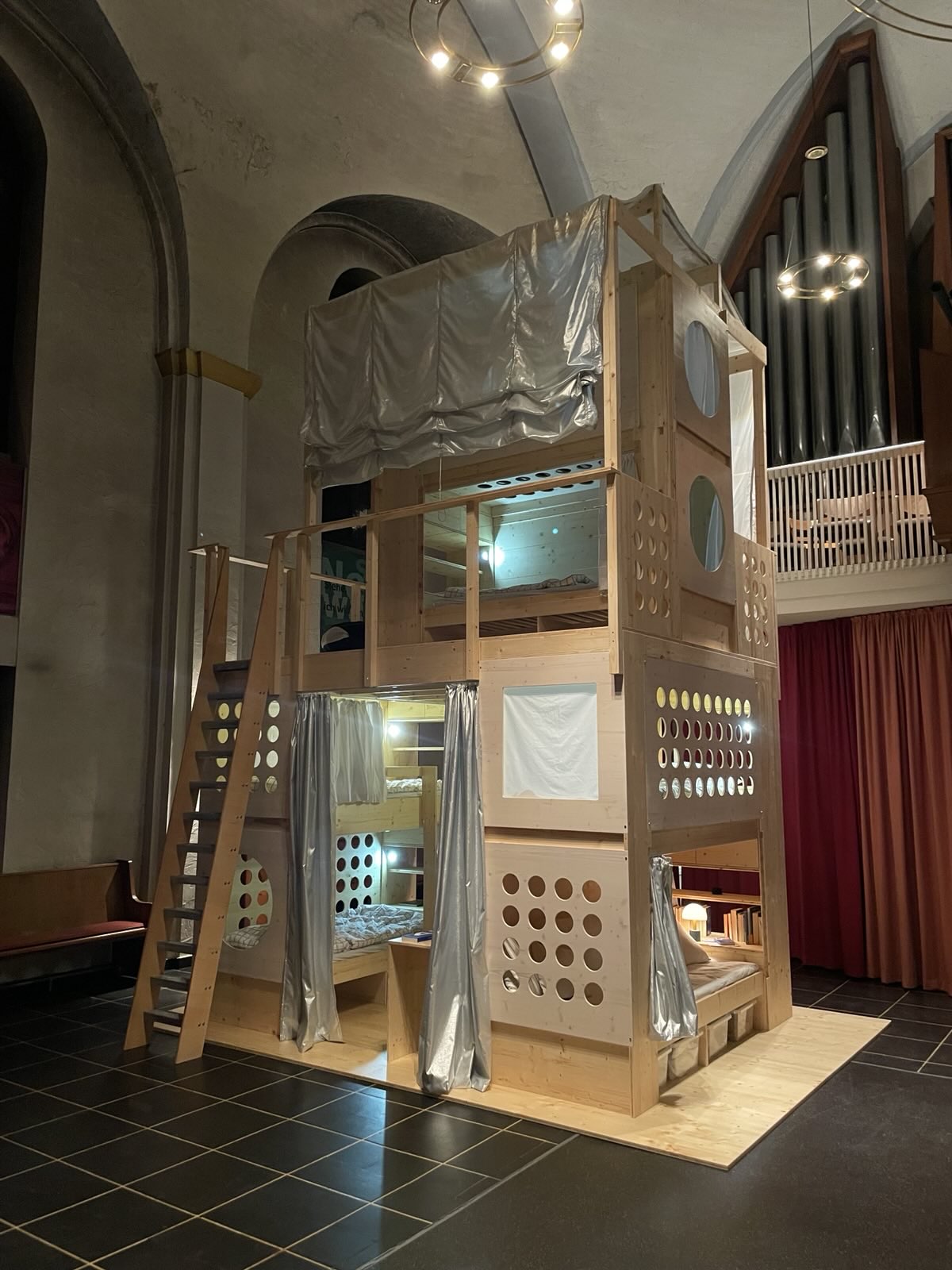 In unserem Kirchen-KO/KON bieten wir Übernachtungen in der Markus-Kirche an: Eine besinnliche Nacht im KO/KON. Eine besondere Form von Einkehr – mit fröhlicher Auferstehung am nächten Morgen. Küche und WC sind vorhanden, eine Dusche ist geplant. Bis zu sechs Personen finden im Kirchen-KO/KON einen bequemen Schlafplatz. In unserer unruhigen Zeit wünschen wir dann den Gästen in unserem Ko/Kon eine friedliche Nacht und gute Träume. Wahrscheinlich wird sich da erfüllen, was im Buch der Sprüche steht: »Legst du dich, so wirst du dich nicht fürchten; und liegst du, so wirst du süß schlafen.« (3,24)