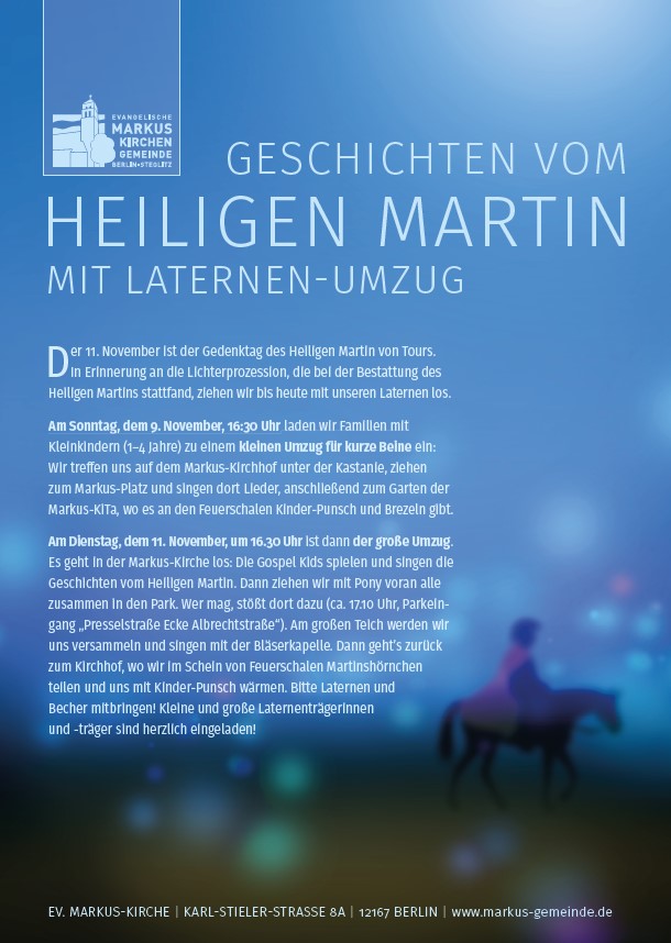 Am Dienstag, dem 11. November, um 16:30 Uhr ist dann der große Umzug. Es geht in der Markus-Kirche los: Die Gospel Kids spielen und singen die Geschichten vom Heiligen Martin. Dann ziehen wir mit Pony voran alle zusammen in den Park. Wer mag, stößt dort dazu (ca. 17:10 Uhr, Parkeingang